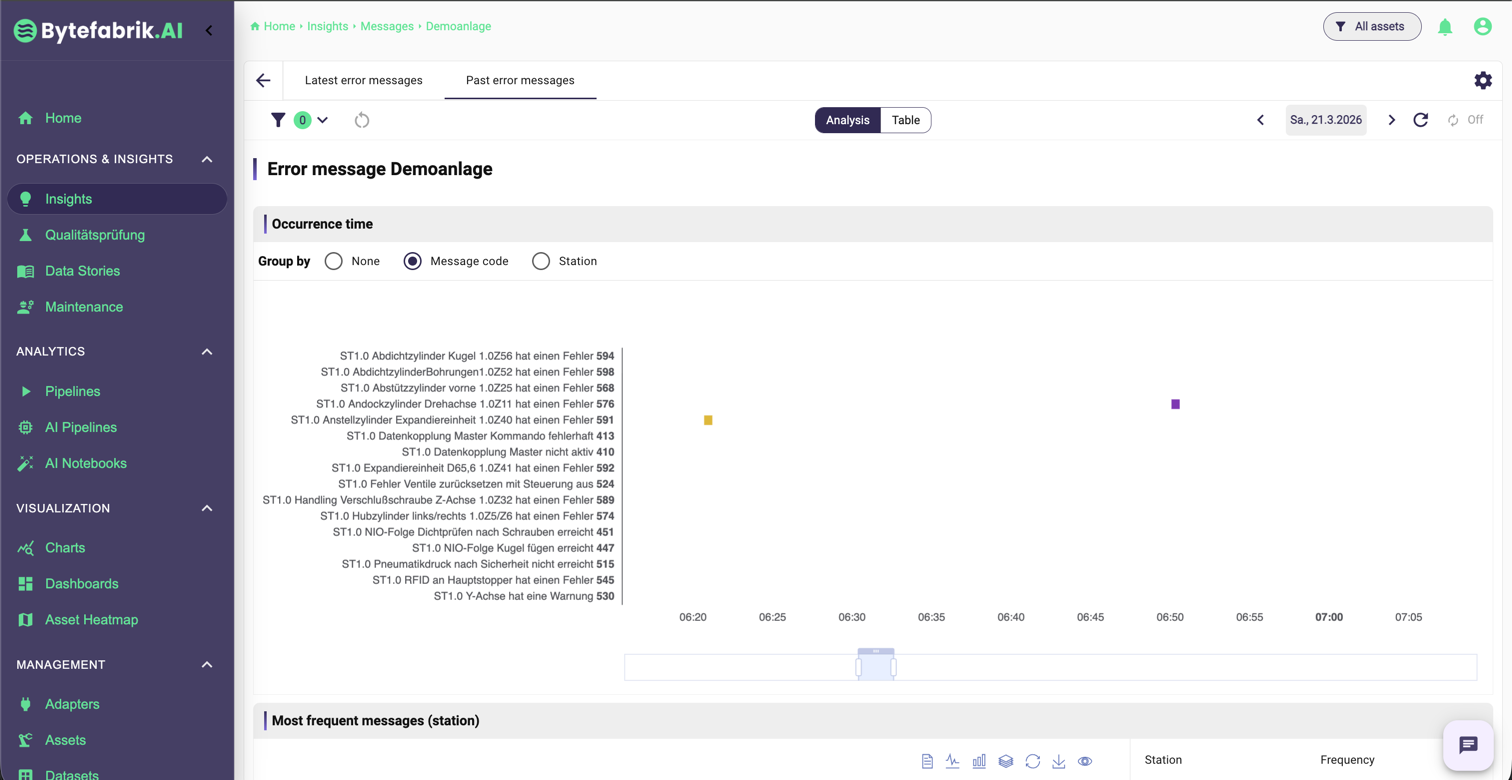 Steuerungsfehler, Warnungen und Störungen lassen sich nach Häufigkeit, Station, Zeitraum oder Prozesskontext auswerten, um wiederkehrende Muster sichtbar zu machen.