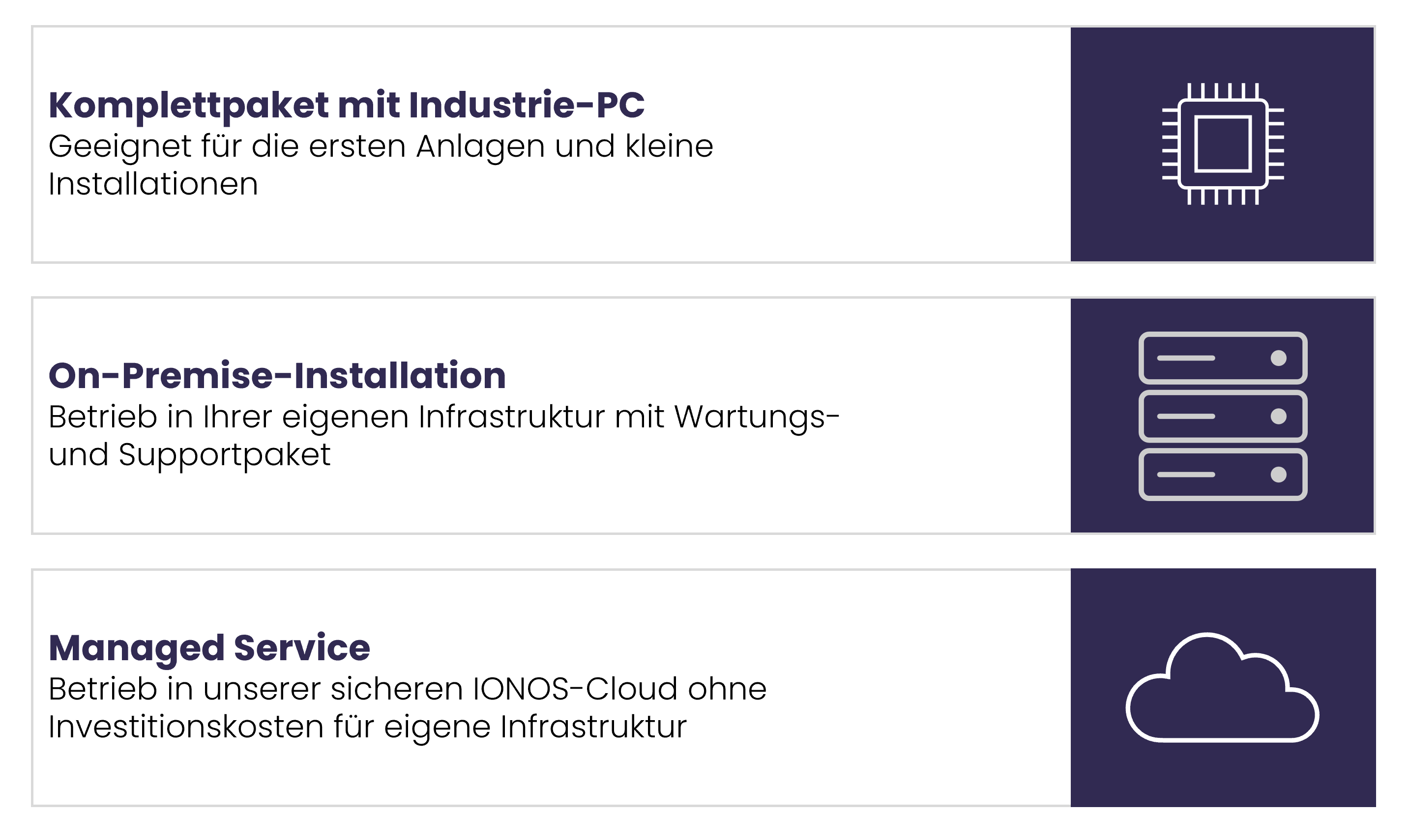 Entscheiden Sie sich für einen Betrieb in Ihrer eigenen Infrastruktur, bieten wir Wartungs- und Supportpakete an, die sicherstellen, dass unsere Lösung immer auf dem aktuellsten Stand ist. Wir können die Software wahlweise auf einem Industrie-PC, einer virtuellen Maschine oder in ihrem bestehenden Kubernetes-Cluster bereitstellen.