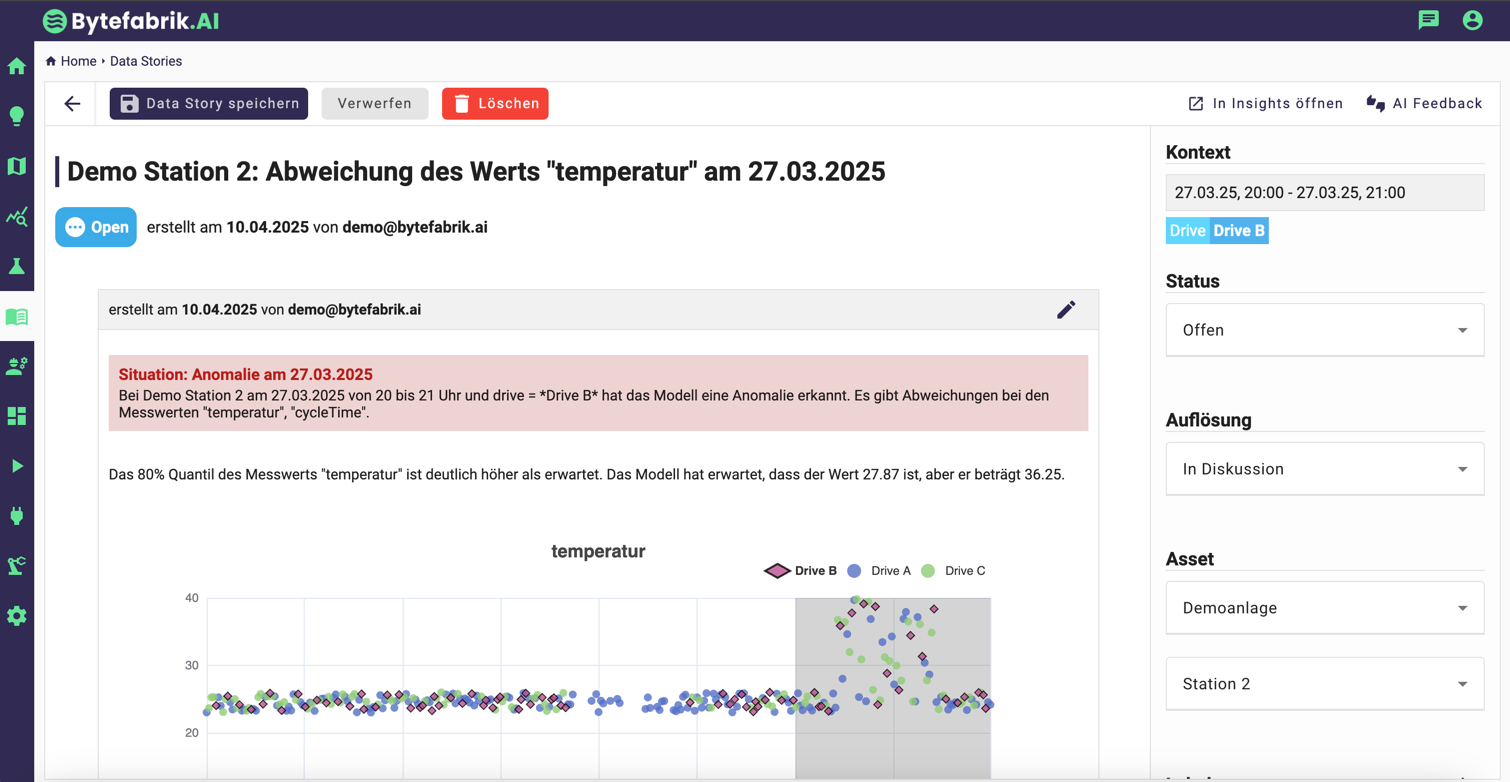 Sobald der Copilot ein ungewöhnliches Muster erkennt – ein unerwarteter Temperature‑Spike, eine untypische Taktzeitabweichung oder plötzlich erhöhte Nacharbeit, erstellt er automatisch eine Data Story. Die komplett KI-generierte Data Story enthält eine Situationsbeschreibung, den relevanten Anlagen- und Produktkontext sowie interaktive Charts, welche das Problem detailliert erläutern.