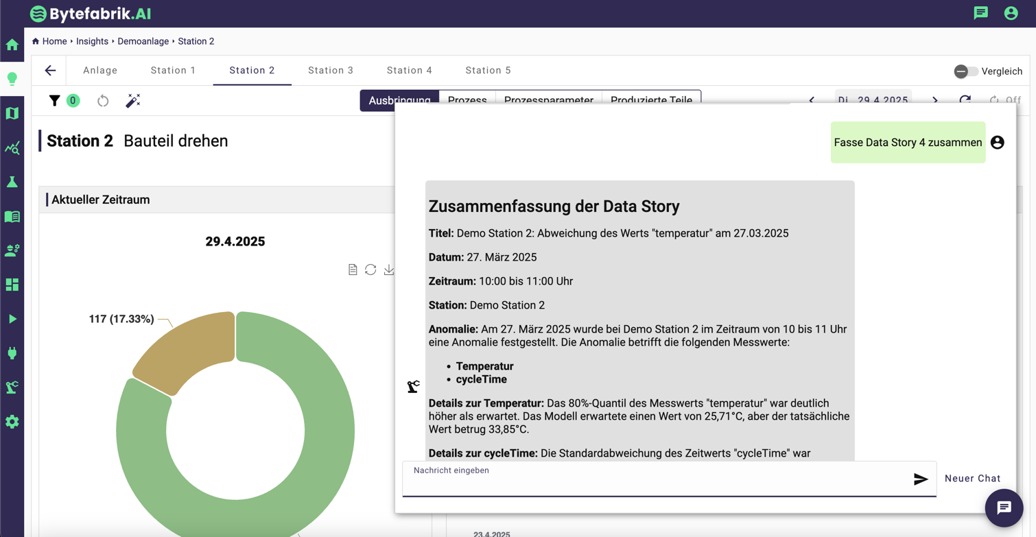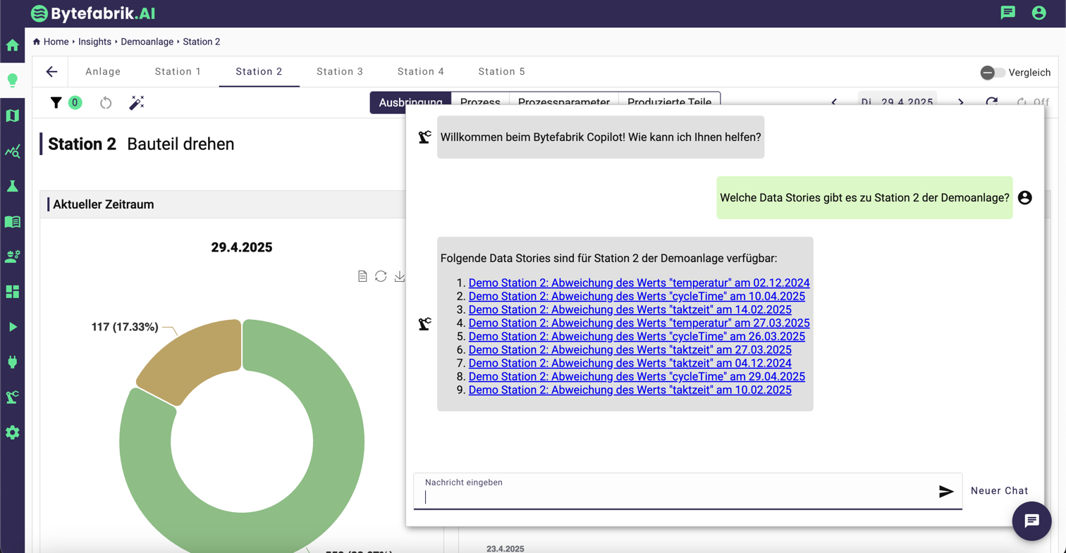 Alle Informationen sofort verfügbar: Ein Chat‑Assistent beantwortet produktionsrelevante Fragen in natürlicher Sprache und mehrsprachig. Der Copilot ist mit den aktuellen Daten der Anlagen-, Meldungs- und Prozessanalyse verknüpft, kann mit Data Stories interagieren, liefert Klartextantworten und verweist auf die Detailansichten der Bytefabrik-Plattform.