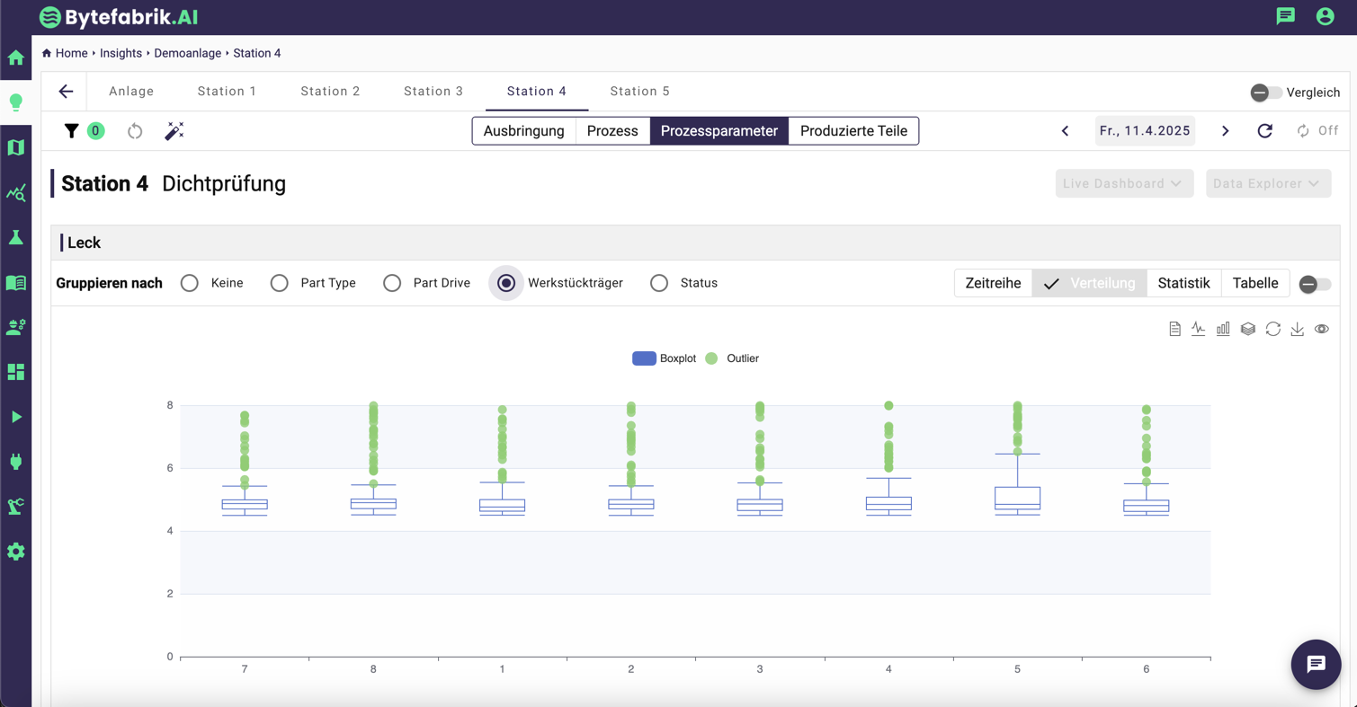 Erfasste und abgeleitete Daten beinhalten Prozessparameter (z.B. Leckwerte), Sensordaten (wie Kraft-Weg-Kurven), Produktdimensionen (beispielsweise Bauteilgruppen und Materialien) sowie Prozessdimensionen (z.B. Werkstückträger oder Werkzeuge).